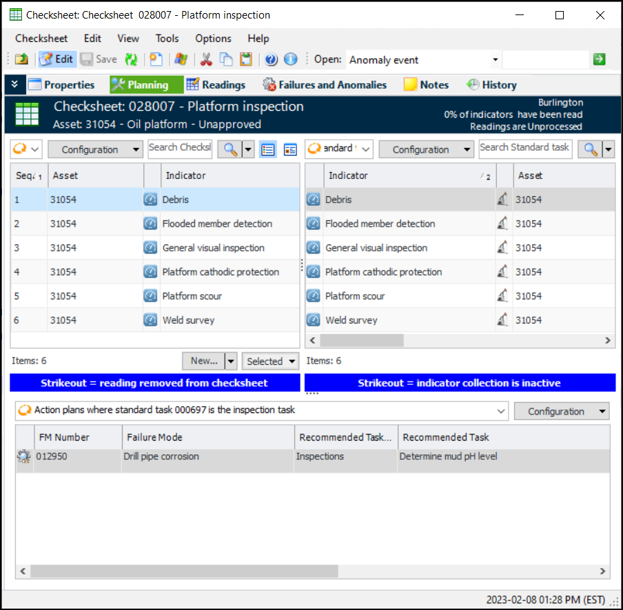 The Planning view is available in the Checksheet window for checksheets that have been generated from a standard task. The checksheet type and checksheet status must support the Planning view feature.The Planning view shows three tables: indicators in the checksheet, the standard task’s indicators, and maintenance action plans that cite the checksheet’s standard task as their inspection task.Adding and Removing Indicator Readings