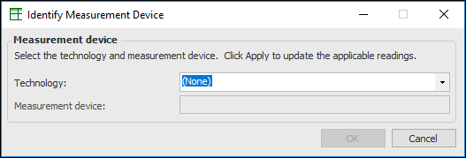 4. If one or more indicators uses a technology that is associated with measurement device assets, you can apply a measurement device to all applicable indicator readings. Click the Tools list and then Identify Measurement Device. The Identify Measurement Device dialog appears.Select a technology and measurement device. When you click OK, only indicators that use that technology are updated.If you enter an input for a calculated indicator, the information appears in the table at the bottom of the window. Click Calculate to view the result. If necessary, you can change the input and click Calculate again. After you process all of the checksheet readings, the calculated indicator’s value is read-only.