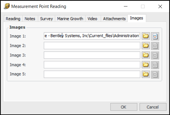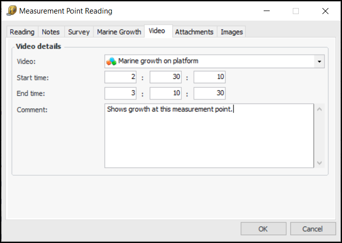 • On the Readings tab, double-click a row to open the Measurement Point Reading window. Fill in the information required and click OK. The information is added to the Readings tab.Tip: If the checksheet type supports videos, in the Measurement Point Reading window you can select the Video tab to add a link to a video file. In the Video list, select one of the files assigned to the checksheet. Specify the start and end times (hours:minutes:seconds) for the footage that pertains to the reading. For example:Tip: In the Measurement Point Reading window, select the Images tab to add a link to an image file by clicking. You can view the image by clicking