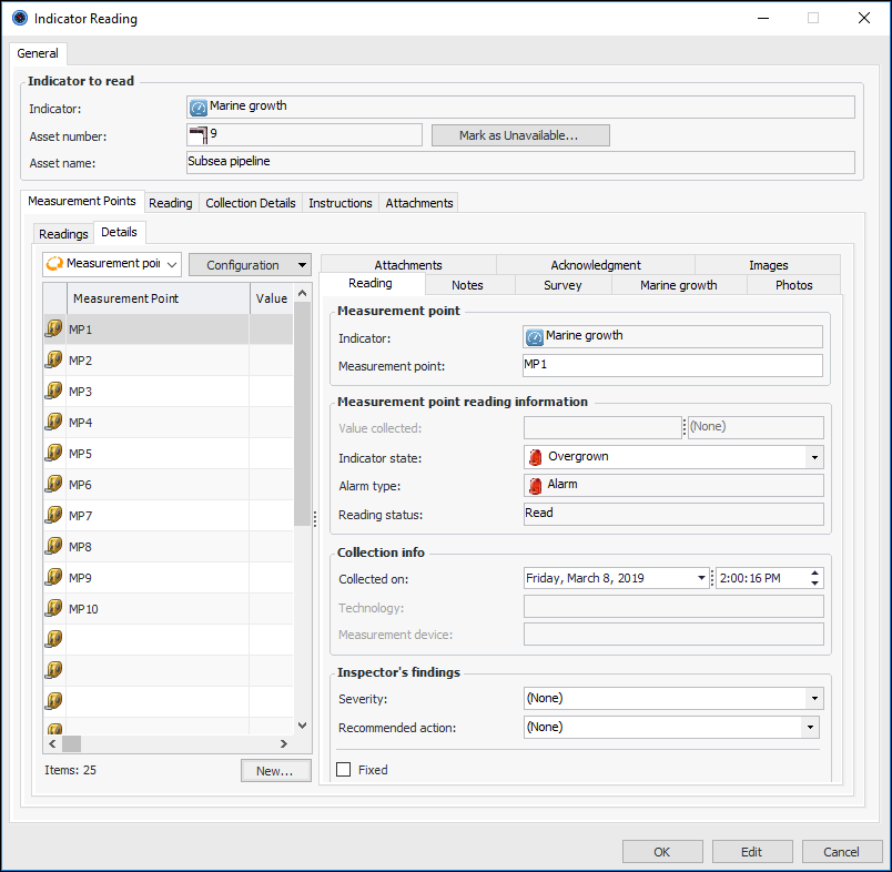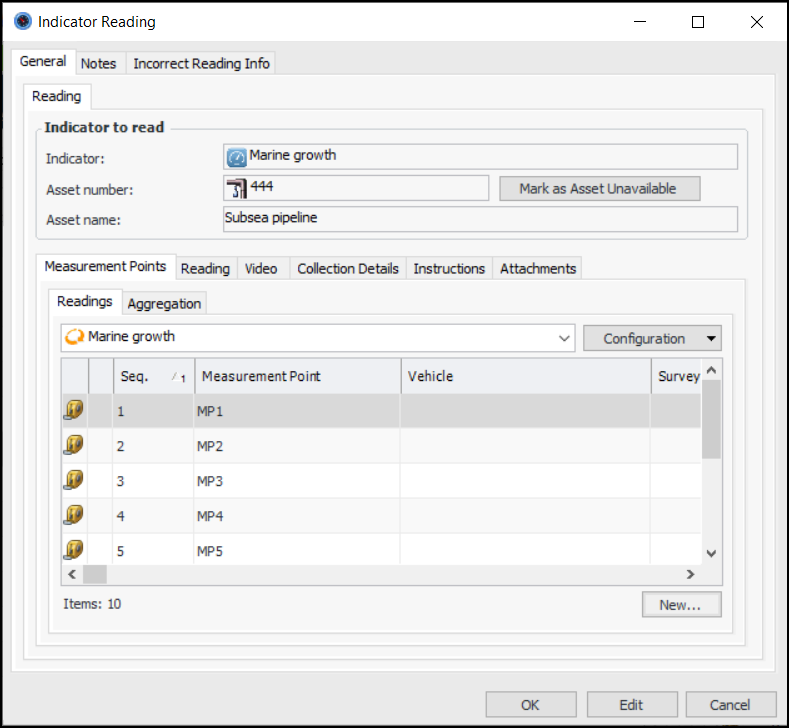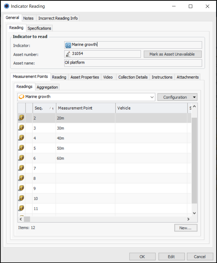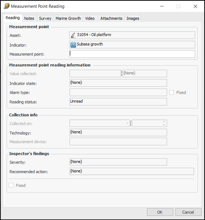 8. From the Readings tab, you can also add variable measurement points. Click New. The Measurement Point Reading dialog appears. For example:Click OK. The Measurement Point Reading dialog closes and the measurement point is added to the table.
