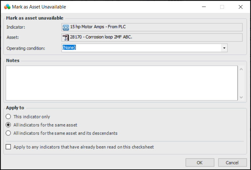 2. Right-click the indicator in the table and click Mark as Asset Unavailable. The Mark as Asset Unavailable dialog appears:Complete the options and click OK. A check mark appears in the Unavailable column, the date and time are filled in, and the operating condition and note that you entered in the dialog are shown.To Enter Indicator Readings on a Checksheet