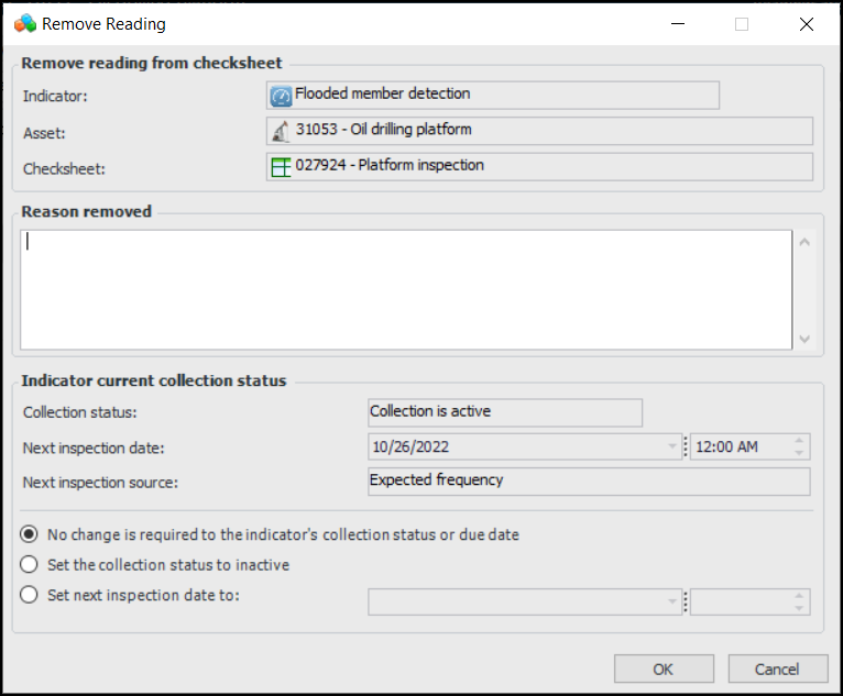 6. Click OK. The Remove Reading dialog closes. The reading continues to be displayed in the Readings tab, but it is shown as gray and scored through. Note that the reading will not appear in printed checksheet reports or asset activity reports. The checksheet’s percent complete is recalculated.Tip: To include an excluded reading, select it in the table, click the Selected list, and click Include. The Include Reading dialog appears, where you can set the collection status back to active and set the next inspection due date.To Mark an Asset as Unavailable