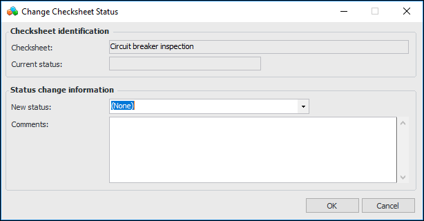 7. The checksheet status might have been set when the checksheet was created. To change the checksheet’s status, click Change Status. The Change Checksheet Status dialog appears. For example: