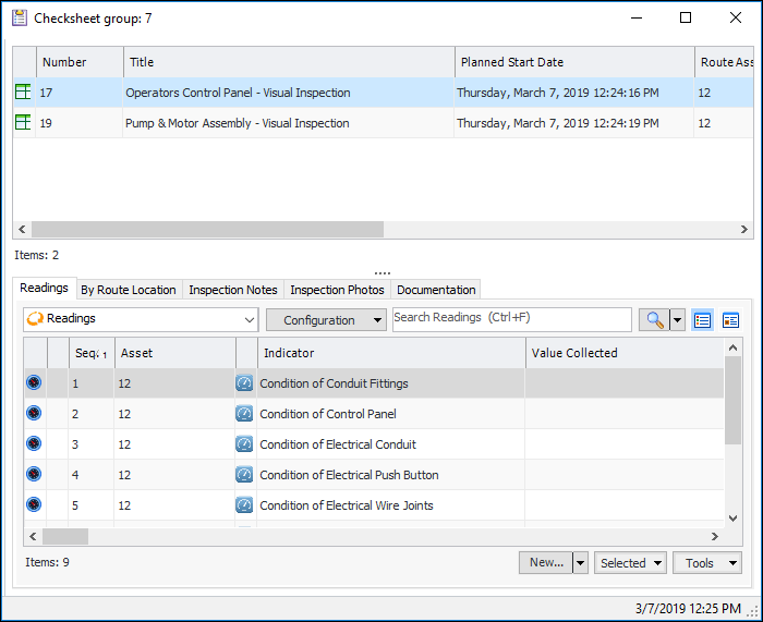 A checksheet is a form that allows you to enter a set (or sample) of indicator readings in APM. The checksheet form contains information about the origin of the indicators, the list of indicators to be read, and space to record readings, make notes, and add inspection photographs and documents. You can create checksheets from a standard task, standard job, PM route, or work order task. You can also create ad hoc checksheets from a Site or Asset window and add the indicators to read.Tip: You can create a checksheet from a work order task, standard task or template, or standard job by opening the source document’s window, clicking the Tools menu, Indicators, and then Create Checksheet.Tip: Checksheets can also be generated from standard tasks at regular intervals. For more information, see Generating Checksheets from Standard Tasks.Note: Indicator readings cannot be entered directly for a standard job that contains a task template.If you have not yet collected the indicator readings and want a printed form to record readings, see Printing a Checksheet Form or Inspection Summary Report.For information about changing a checksheet’s status, see To Set Properties for the Checksheet in this topic.To Create a Checksheet