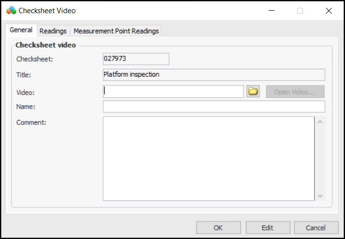 17. If the checksheet type supports videos, the Videos tab is available. You can select it and click New to open the Checksheet Video dialog: