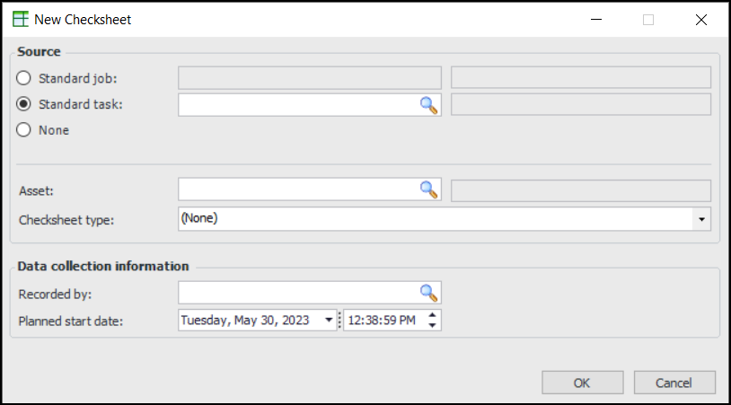 12. The Planned start can be automatically set to the current date and time. Or, the checksheet type can specify that the standard task’s due date is defaulted to the checksheet’s planned start or completion date. You can change this information if required.
