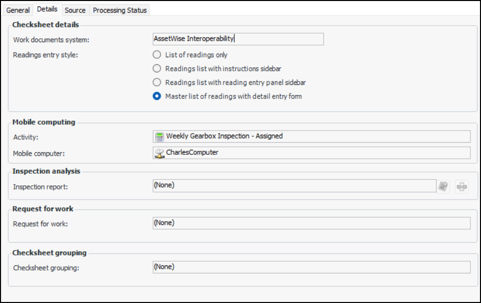14. Select the Details tab:The Work documents system box displays the master system for work documents. For example, if AssetWise Enterprise Interoperability has been implemented to exchange data with an external CMMS, “AssetWise Interoperability” is displayed.