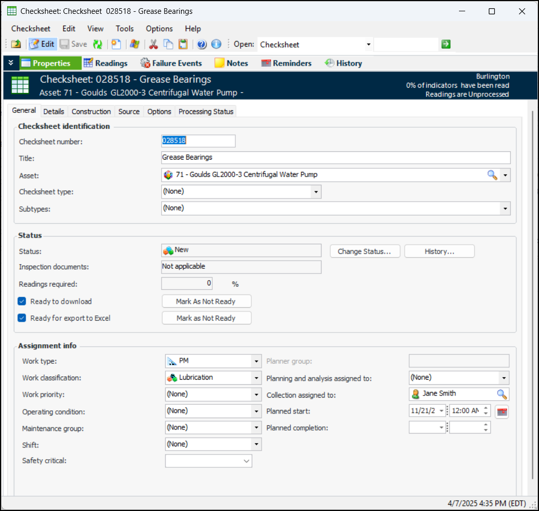 1. In the Checksheet window, select the Properties view, General tab. This tab includes identification and assignment information for the checksheet, which can be copied from the source object. Here is an example of a checksheet created from a standard task: