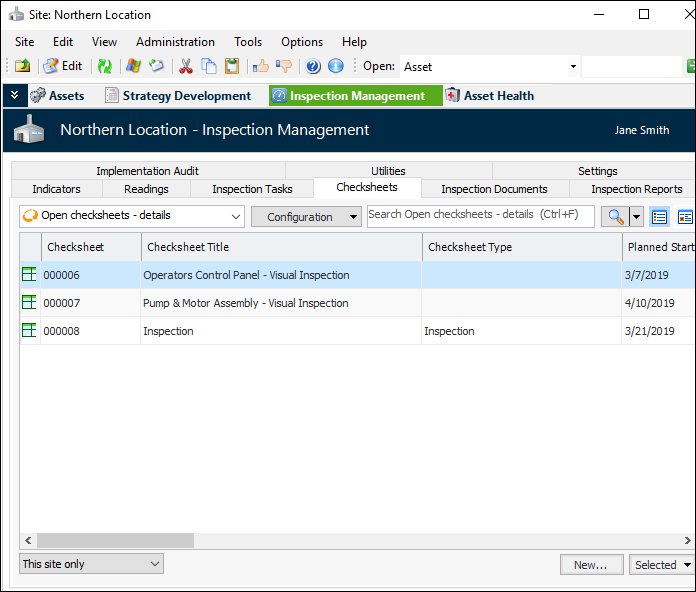 2. Select the Checksheets tab. This tab shows the checksheets for the site or asset. In this example, the “Open checksheets - details” configuration is selected: