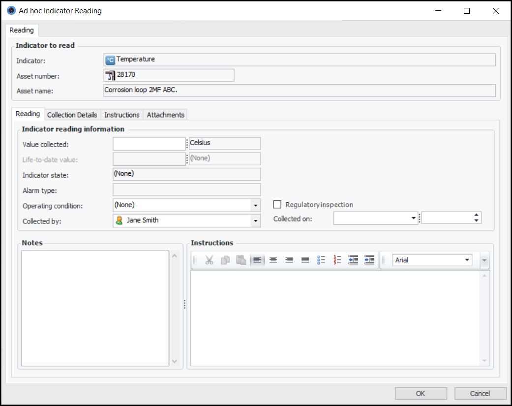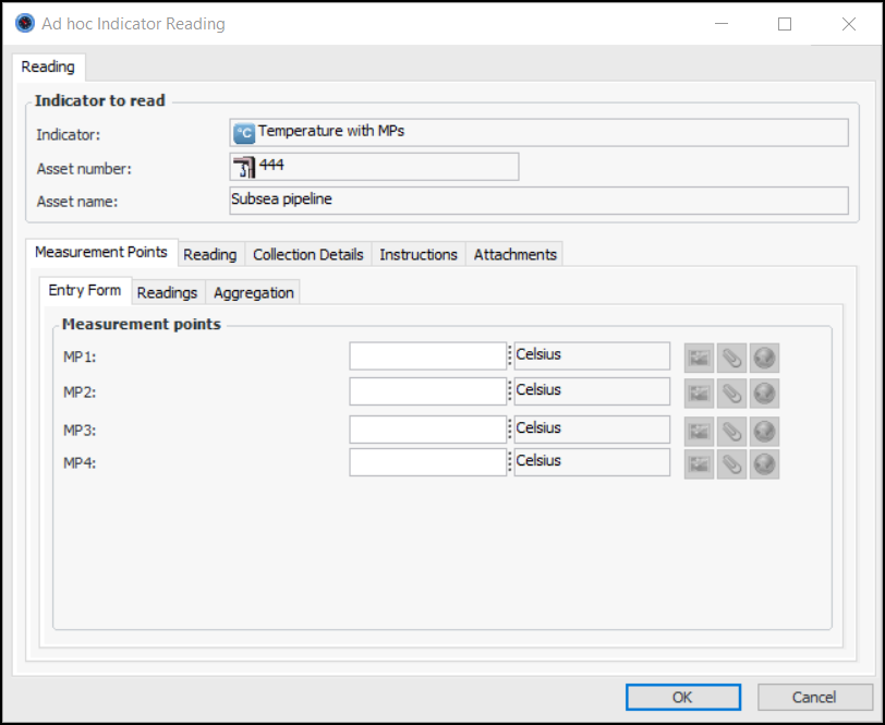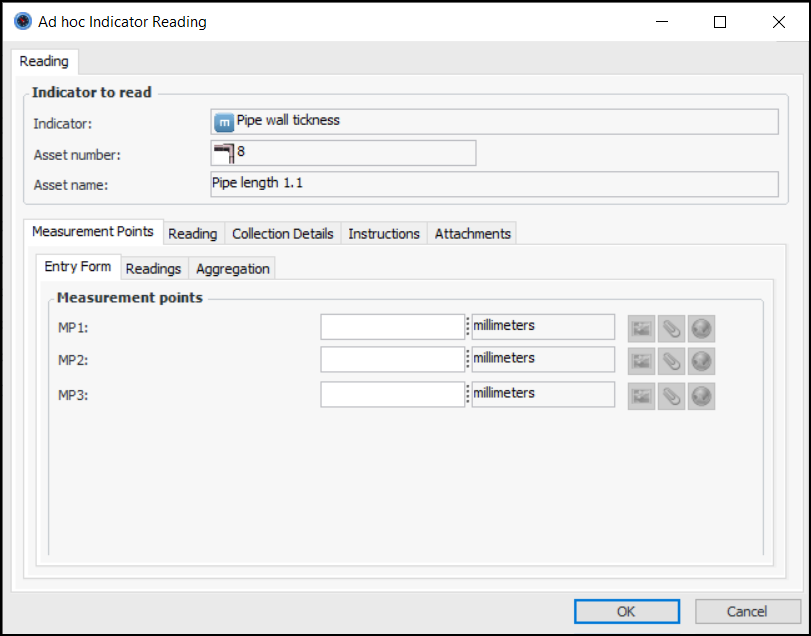 14. Click OK to save the reading and close the dialog.To Enter Ad Hoc Readings for Measurement Points