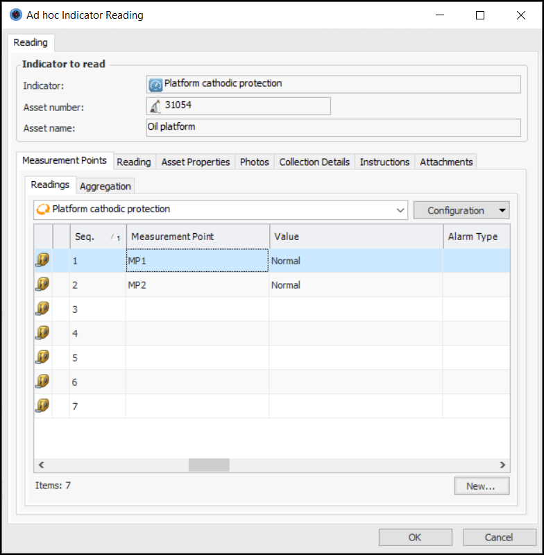 7. From the Readings tab, you can also add variable measurement points. Click New. The Measurement Point Reading dialog appears. For example:Click OK. The Measurement Point Reading dialog closes and the measurement point is added to the table.