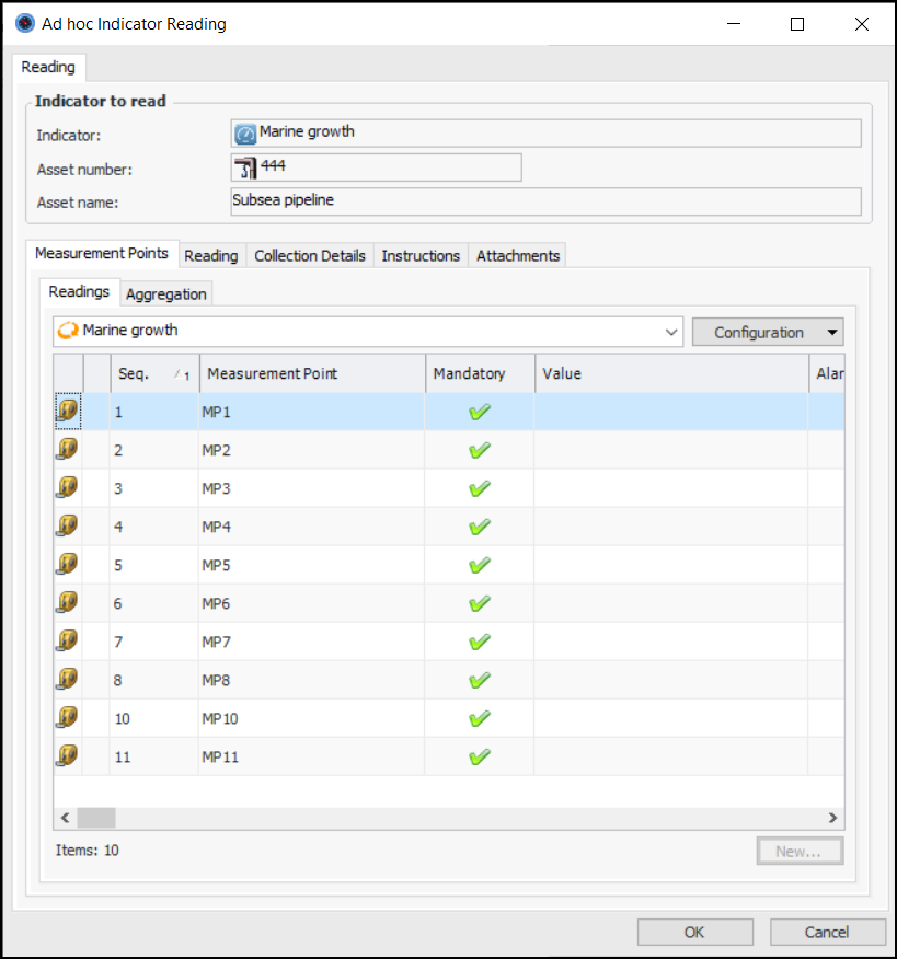 3. Right-click the indicator and click Enter Reading. The Ad Hoc Indicator Reading dialog appears. Here is the dialog for an indicator with fixed measurement points; that is, the points are named:Any required points have check marks in the Mandatory column when they are shown in a table.The Aggregation tab displays information about the indicator and the readings, including the aggregated value of the readings, the aggregated state, the method of aggregation (sum, average, median, maximum or minimum), and the measurement point used to determine the overall reading if a single point is used.