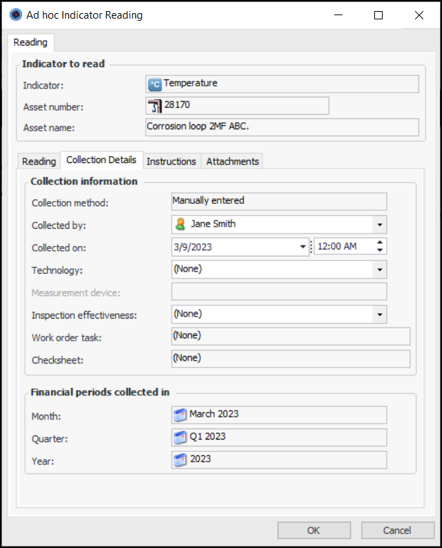 10. On the Collection Details tab, you can modify the date and time the reading was collected, if necessary. If the indicator uses a technology associated with measurement device assets, you can select the measurement device used to take the reading.