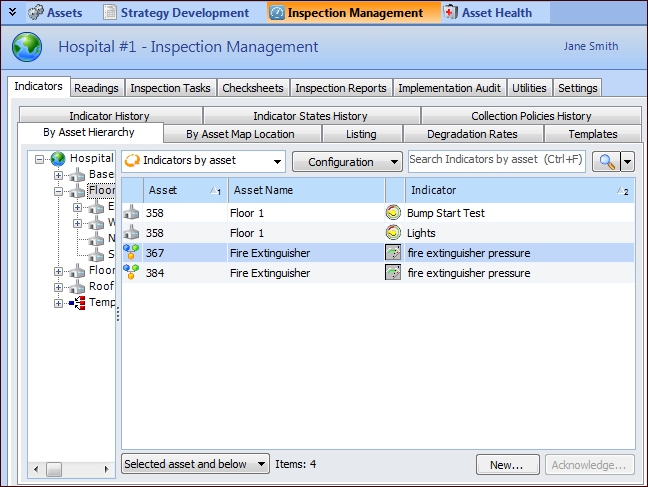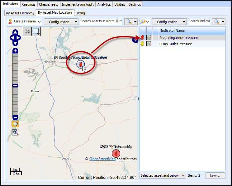 1. Tip: You can also select an asset on the map from the By Asset Map Location tab. By default, indicators for the selected asset and below are listed in the table. For example:
