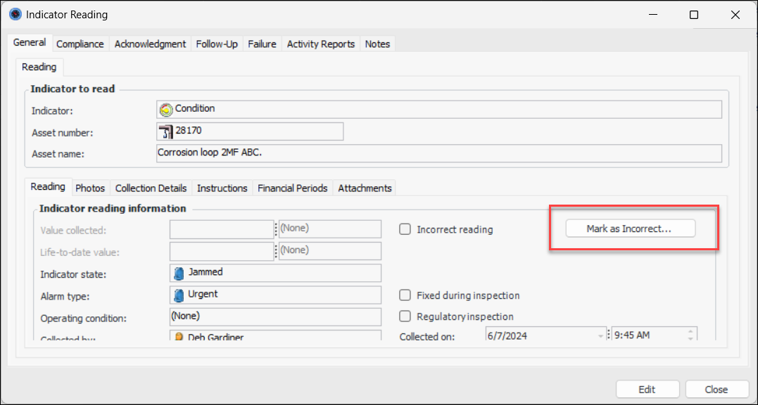 3. Click Mark as Incorrect.A confirmation window appears where you can select a reason and provide comments. When you click OK, the window closes, Incorrect reading is selected, and the button label changes to Undo Mark as Incorrect.If you wish to reverse your decision, click Undo Mark as Incorrect. If a failure record was canceled when you marked the reading as incorrect, the failure’s status changes to Open after you undo the flag.To Mark a Reading as Incorrect from the Site Window