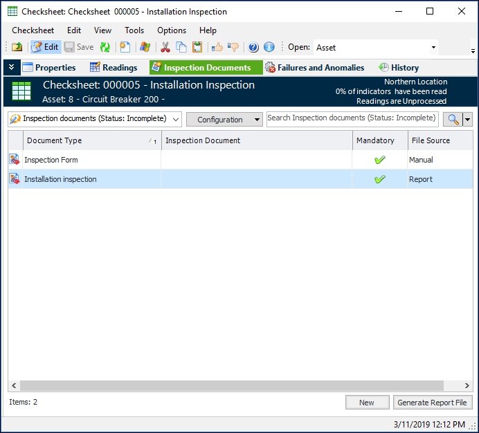 Support for inspection documents is a feature of the checksheet type. Checksheets for which inspection documents are supported or mandatory display the Inspection Documents view, where you can add, view, and open documents as well as generate reports.Tip: Inspection documents can be viewed from the Site or Asset window by selecting the Inspection Management view and the Inspection Documents tab. At the site level, this tab lists all inspection documents created on the site. The asset’s Inspection Documents tab lists all inspection documents created for the asset on checksheets that reference it.For information about setting up APM to attach inspection documents, see Setting up Inspection Document Types and Classes.To Work with Inspection Documents