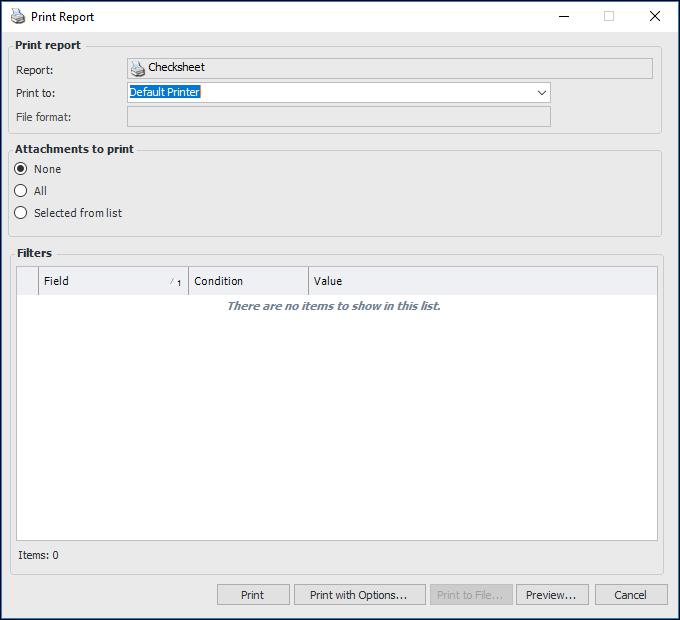 3. Right-click the checksheet, click Print, and then Checksheet or Inspection Summary. The Print Report dialog appears. For example: