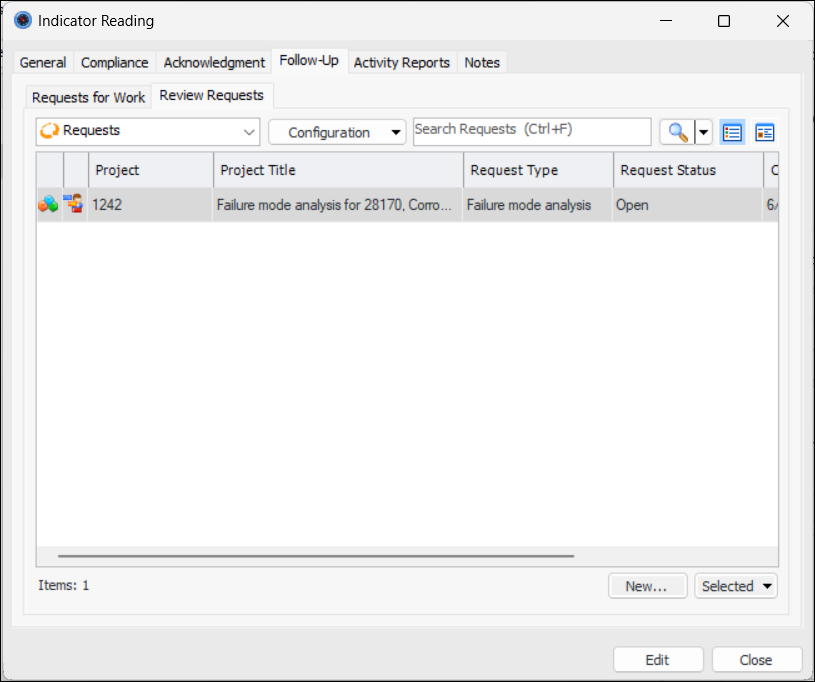 8. You can view the review request and project by double-clicking the reading to open the Indicator Reading window. Select the Follow-Up tab and then the Review Requests tab. For example:Tip: You can also view and create failure mode review requests in the Indicator window. Select the Usage view and Review Requests tab.
