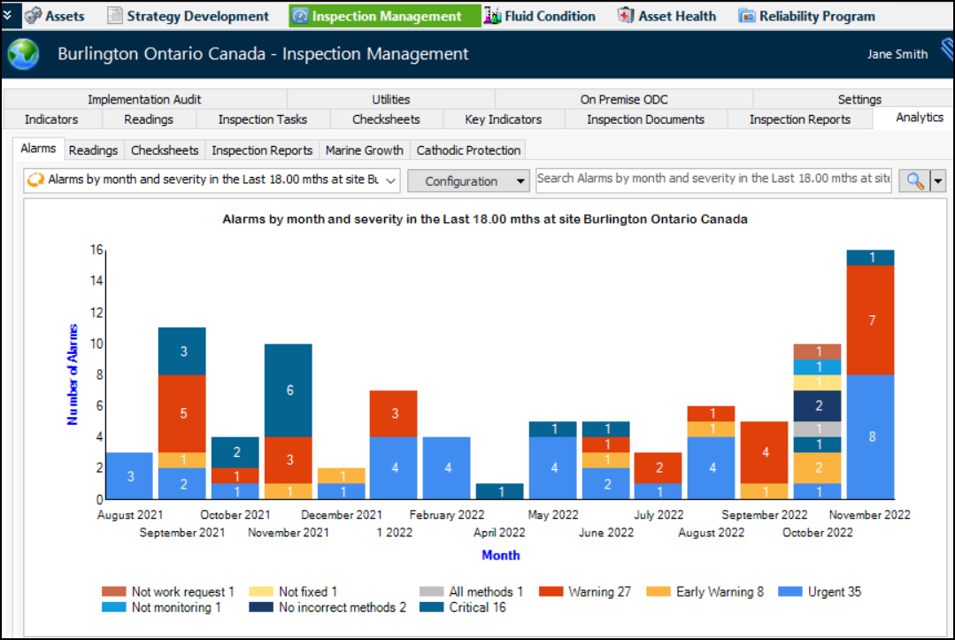 Inspection Management view to display a variety of information, ranging from alarms, readings, and inspection reports to marine growth and platform cathodic protection. You can also specify the time period (in days, weeks, months, or years) for the data.