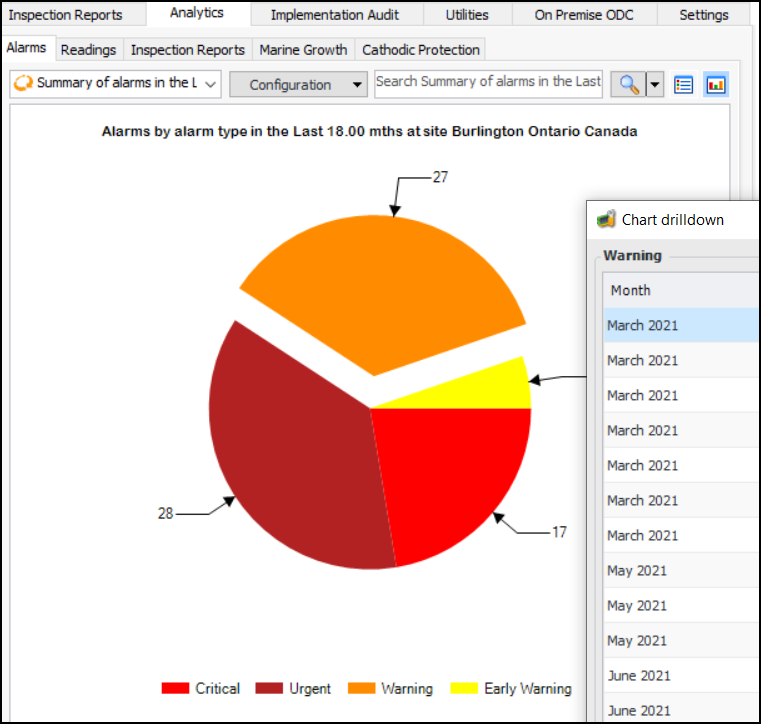 You can use the “Dashboard - Indicator Analytics Marine Growth” site panel in the Analytics tab and other dashboards to display a point style chart of measurement point readings with the marine growth subtype. Depth and Hard Cover are the chart co-ordinates.