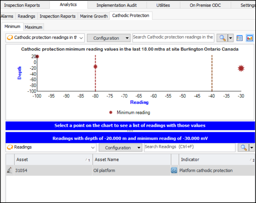 You can use the “Dashboard - Indicator Analytics Platform Cathodic Protection” site panel in the Analytics tab and other dashboards to display point style charts of measurement point readings with the platform cathodic protection subtype. One chart shows the maximum reading and the other the minimum reading. Depth and Reading are the chart co-ordinates.