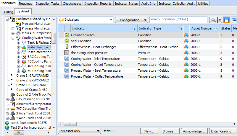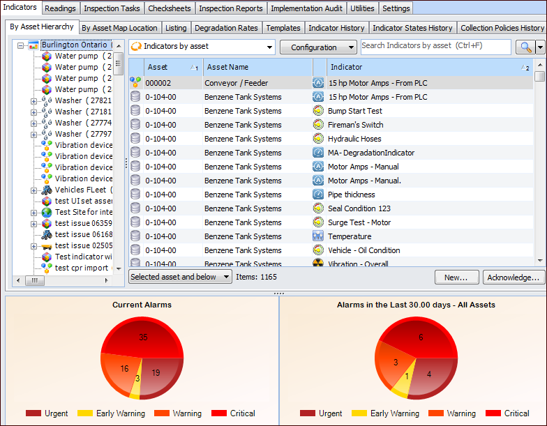 2. Select the Inspection Management view, Indicators tab. On the By Asset tab, you can view the asset’s hierarchy. Select an asset to view its indicators and alarms in the table to the right. Alarm statistics are shown below the table. For example: