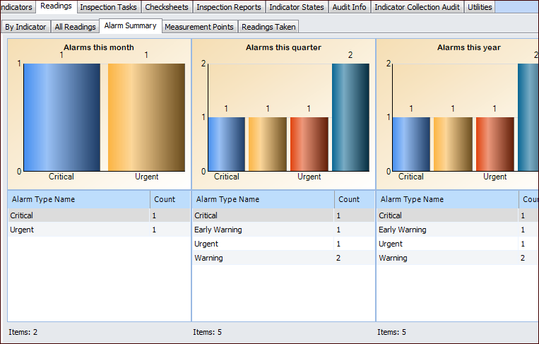 6. On the Readings tab, select the Alarm Summary tab. This tab summarizes indicator readings according to the current month, quarter, and year. For example: