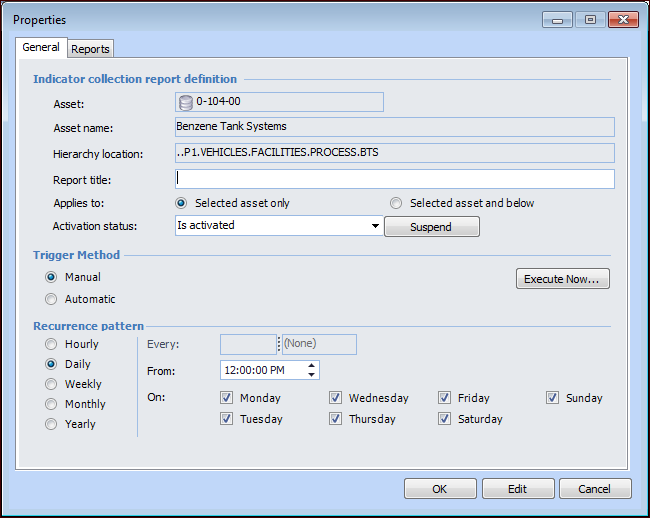 • Automatic – The report is generated at intervals according to the recurrence pattern defined for it. For information about setting the interval, see Defining Recurrence Patterns.A scheduled action must be set up to run the Generate Indicator Collection Audits method. See Creating a Scheduled Action.To Manually Execute a Report