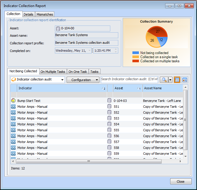 1. In the Asset window, select the Inspection Management view, Utilities tab, Collection Audit tab, and then the Reports tab. This tab lists the reports that have been generated, as well as the dates on which they were generated.Tip: Select the Utilities tab, Collection Audit tab, and then the Indicators tab to view summaries of the audit and indicator collection. Select from the table configurations on this tab to view detailed information about the most recent report.