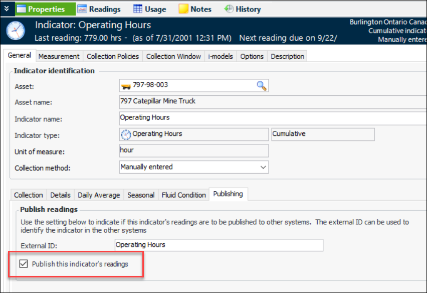5. Create or update indicators or indicator templates to allow readings to be published. In the Indicator window, select the Properties view and General tab. The Publishing tab is available if the indicator type supports publishing. Click Publish this indicator’s readings.