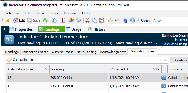 Open the Indicator window, select the Readings view and the Calculation Times tab. The “Calculation time” table displays the indicator’s readings and the time it took APM to calculate each reading value in milliseconds. For example:To View the Site’s Indicator Calculation Times