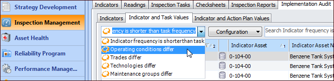 On the Site window, select the Inspection Management view and the Implementation Audit tab. There you can view indicators associated with multiple action plans, indicators not associated with an action plan, and much more. Each of the tabs provides table configurations that help you survey how indicators are currently used. For example:The Implementation Audit tab is also available under the Utilities tab, where it complements the Collection Audit tab’s information.To View an Asset’s Indicators and Failure Modes