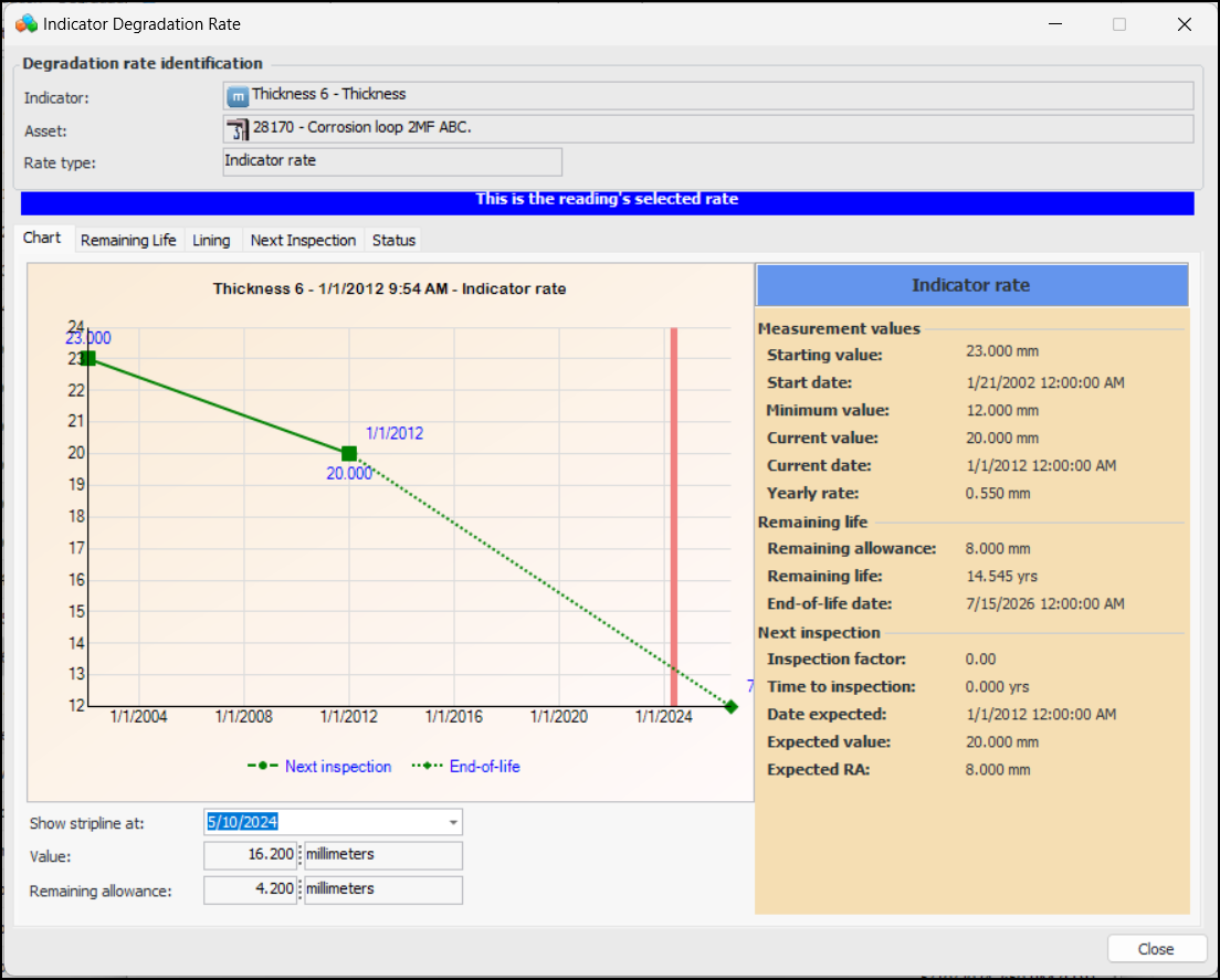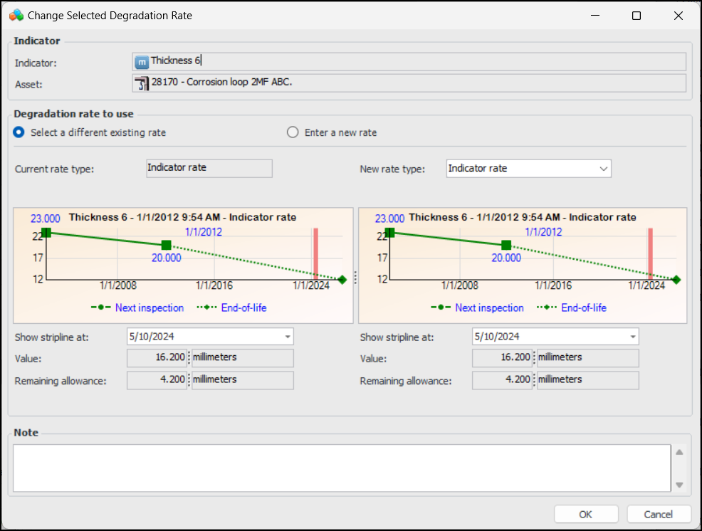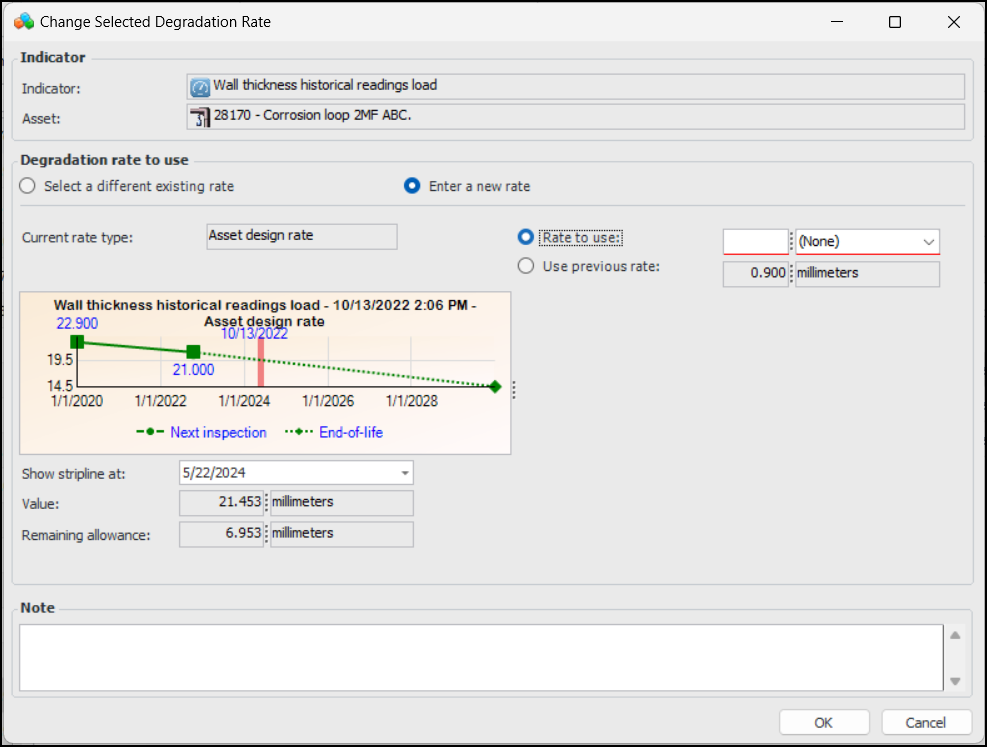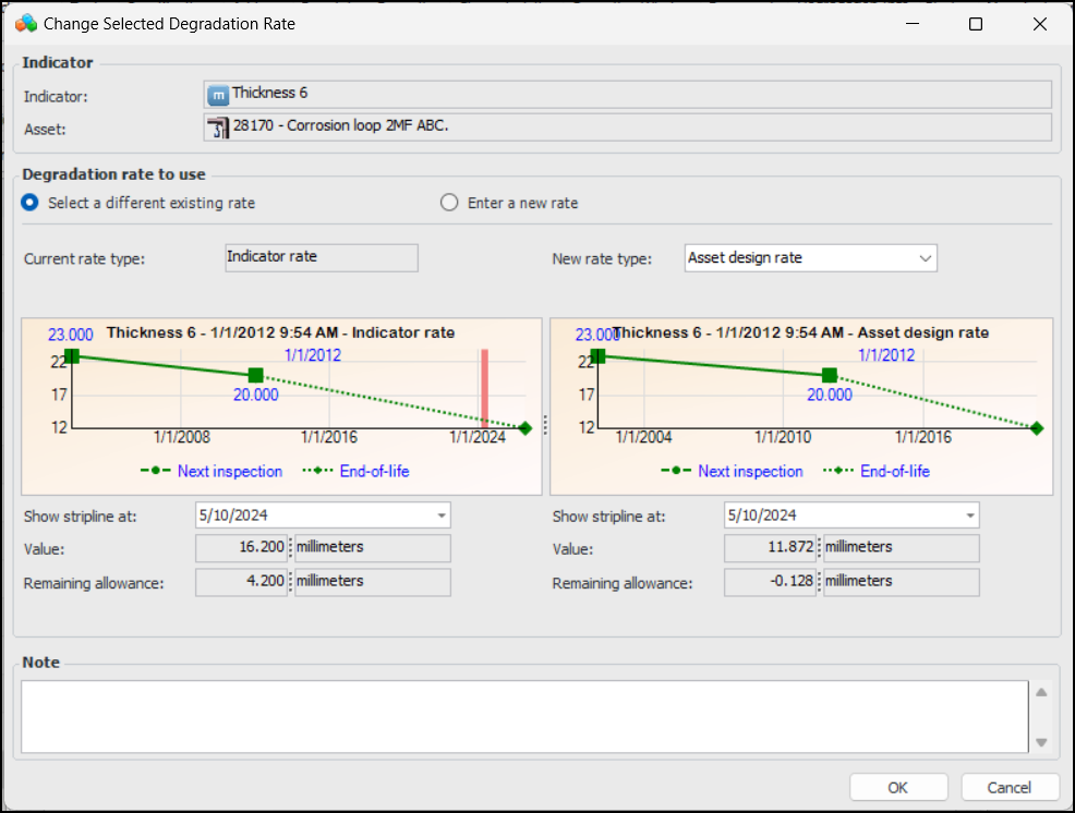 6. Click OK. The dialog closes and the Rate type to use value changes accordingly. Values such as end of life date, remaining life, and next inspection date are updated.