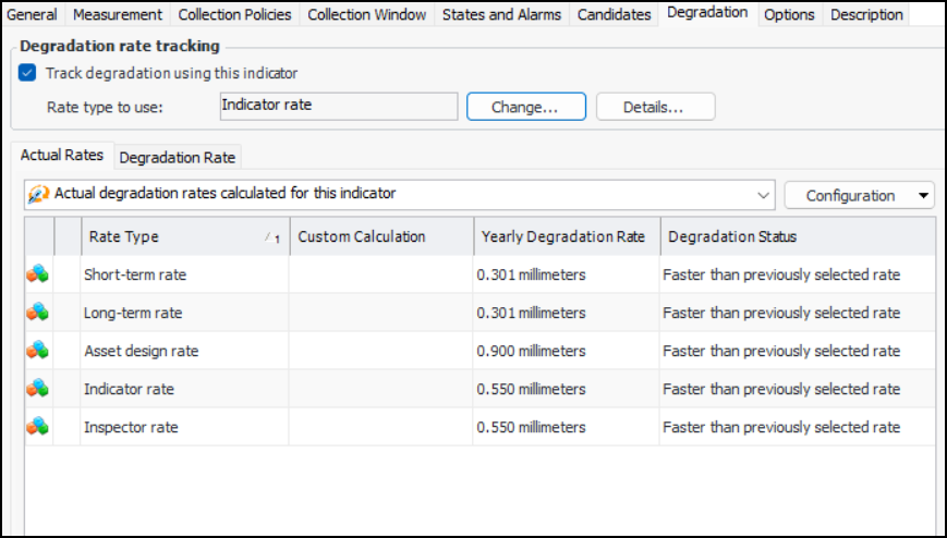 Numeric indicators that track degradation information provide detailed information about the selected rate type, actual and expected rates, remaining life, and next inspection dates. In the Indicator window, Properties view, select the Degradation tab and the Actual Rates tab. For example:Note: You can also reset the start date for degradation on an indicator. For more information, see Resetting an Indicator’s Degradation Rate.You can switch to a different rate type to use by clicking Change. The Change Selected Degradation Rate window provides charts to test the effect of the change before committing to it. For example:To Change an Indicator’s Degradation Rate