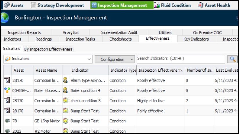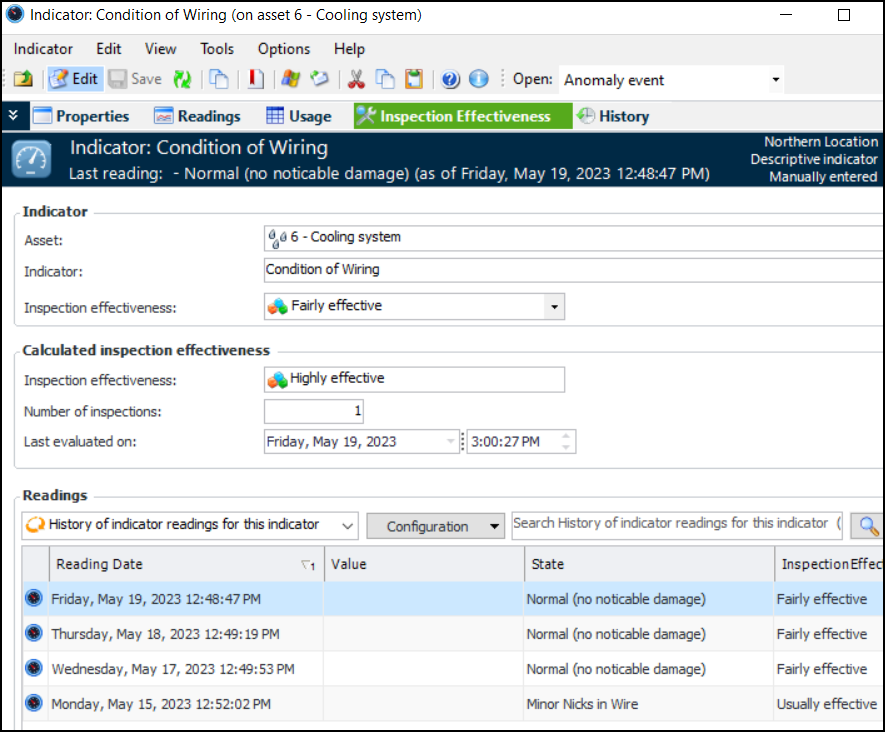 • Inspection effectiveness shows the calculated value based on the readings and the rules