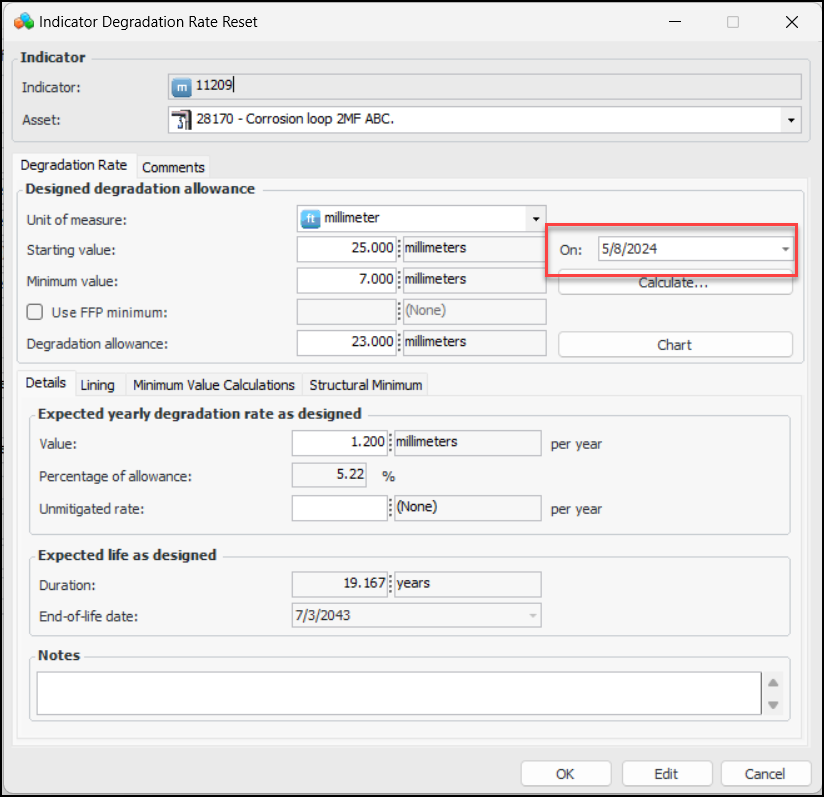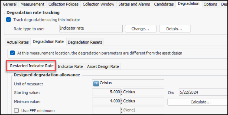 2. When the reset is saved, the Degradation Resets tab is added to the Indicator window. For example:In the Degradation Rate tab, you will find the Restarted Indicator Rate tab, as well as the Indicator Rate and Asset Design Rate tabs.Note: When an indicator has been reset, the Change Design Info button is no longer available. You can perform another reset to change design information.You can view resets at the site level by selecting the Inspection Management view, the Indicators tab, and the Degradation Resets tab.