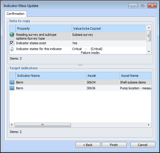 6. Click Next. The Confirmation page appears, listing the values that you chose to copy and the target indicators.