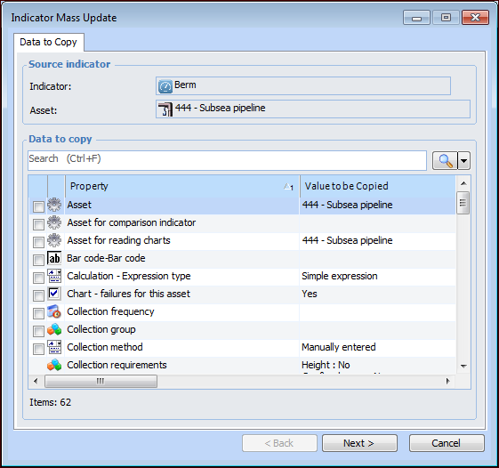 2. Tip: You can also right-click the source indicator wherever you find it in a list and then click Copy Values To.The Indicator Mass Update wizard appears, displaying the Data to Copy page. This page lists only the data members that are available to copy, for example, attributes, collections, and simple references. For example:If you are copying from an indicator template, the Asset box does not appear.Note: Dependencies might exist between a data member that you select and another data member. For example, to update a numeric indicator’s states, its “Indicator states exist” attribute must be set to “Yes”. If you don’t know that all of the targets’ have states, also copy the “Indicator states exist” attribute from the source indicator. For information about dependencies between data members, see Overview of the Mass Indicator Update Wizard.