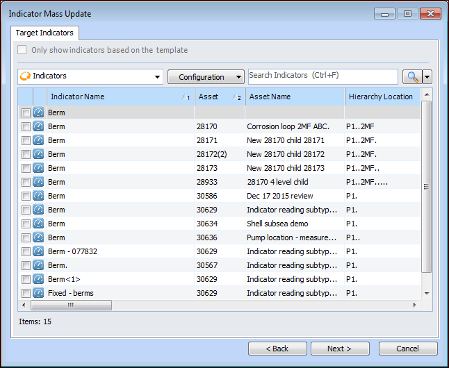 4. Click Next. The Target Indicators page appears. This page lists all of the indicators of the source indicator’s type that are located at the same level or lower in the site hierarchy.