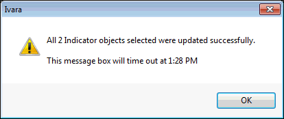 8. When you are ready, click Finish. A progress dialog appears.If you wish to stop the process, click Cancel. Stopping the wizard will not undo any changes that have been applied up to that point. However, it will stop the update request from being applied to any of the remaining unprocessed indicators. When this occurs, the status of the Indicator Mass Update request is shown as “Stopped”. A log of the indicators that were successfully updated is saved with it.