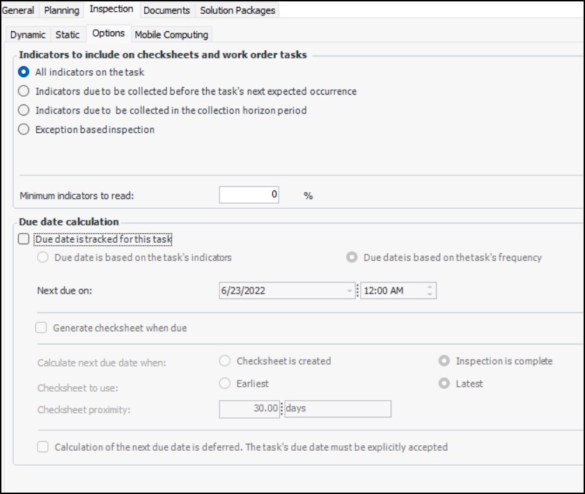 Note: Standard tasks with frequencies based on a recurrence pattern do not support due-date calculations.Setting the task’s due date can also be deferred. The calculated date is then classified as “pending” and must be manually accepted. For more information, see Working with Standard Task Due Dates.Note: Variable due date calculations is a “generally available” product feature. You must first enable feature 117 to use the functionality in APM. In the Enterprise window, select the Features view and the Enabled Features tab. Click Browse, select “Ability to define standard task due date calculation until inspection is complete” and click OK. If APM is running as a smart client, click Refresh Enabled Features on the server. Then restart the client to use the functionality.To Set Inspection Options