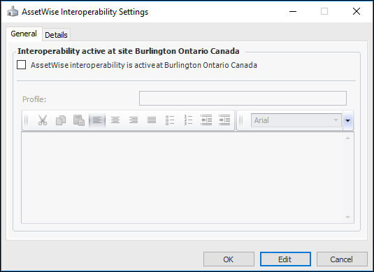 1. For each site that will support interoperability, click the Administration menu, Interoperability and Integration Settings, and then AssetWise Interoperability. The AssetWise Interoperability Settings dialog appears.