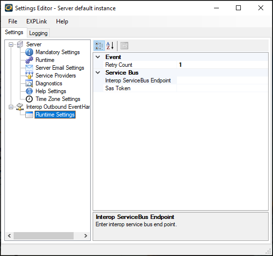 6. Under the Interop Outbound Event Handler node, click Runtime Settings. Scroll down to the Event section. For example: