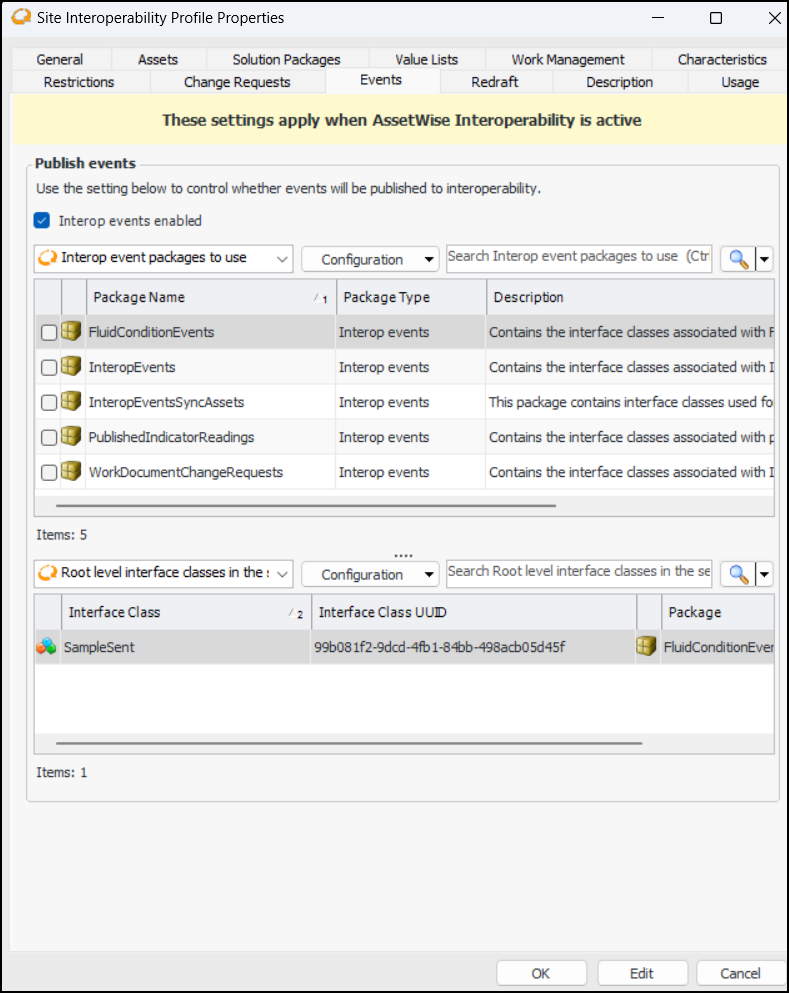 3. In the Site Interoperability Profile dialog, select the Events tab and select Interop events enabled. For example: