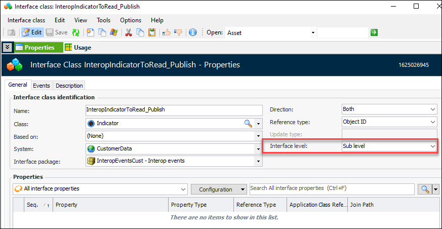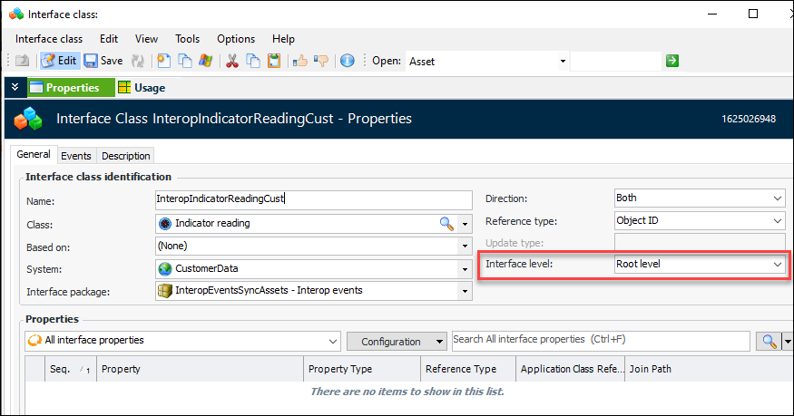 10. In the Interface level list, select either “Root level” or “Sub level”. The interface class associated with an object that triggers the generation of an event must have the interface level “Root level”. Here is an example of the indicator reading interface class, which triggers an event: