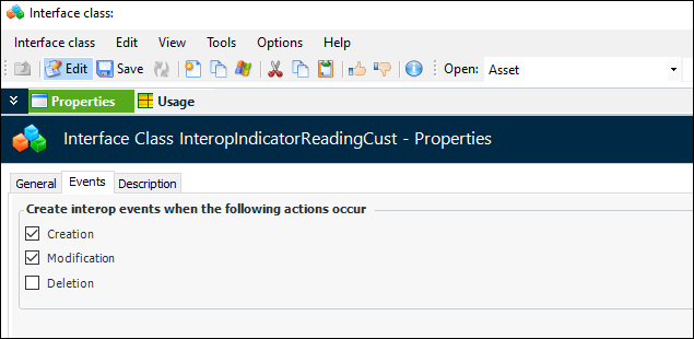 11. On each root level interface class, select the Events tab and select the actions that will trigger interop events.