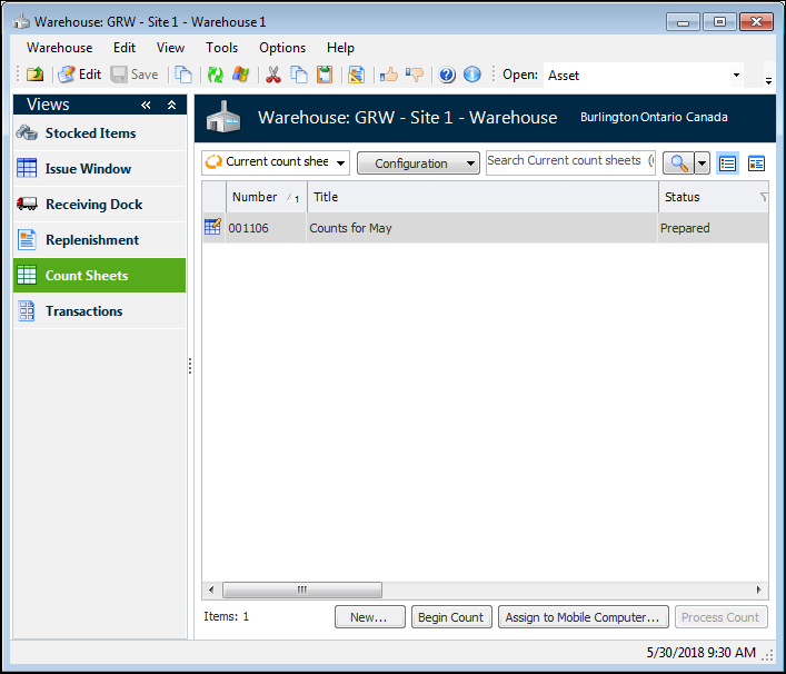 3. Select the Count Sheets view. Current count sheets are listed. For example: