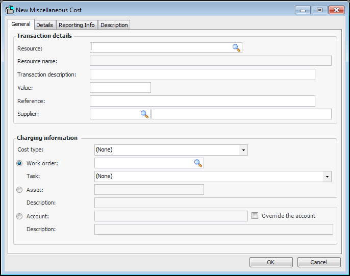 To create a miscellaneous maintenance cost transaction, you must have a cost type to which you can charge the transaction. Miscellaneous transactions can only be charged to cost types where the Miscellaneous expenses option is set to Available for use.To Create a Maintenance Miscellaneous Cost Transaction