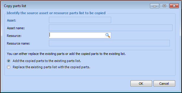 10. Click OK. APM copies the parts list from the target resource. If you selected to replace the parts list, APM replaces the parts list with the copied list.