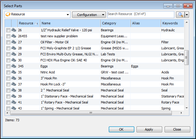 7. Select the parts that you want to add to the material or tool and click OK. APM adds the selected parts to the resource’s parts list.